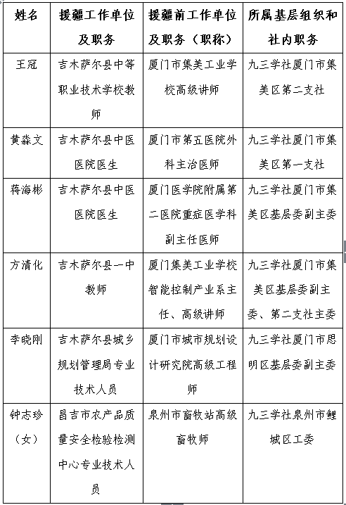 近日,福建省人民政府作出給予我省第七批援疆和第十一批援寧工作隊記集體二等功的決定。廈門市5位九三學社社員王冠、方清化、李曉剛、蔣海彬、黃淼文,泉州市社員鐘志珍作為第七批援疆工作隊成員受記功獎勵。6位社員情況如下: