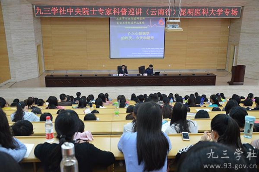 九三學社中央常委、中國科學院院士、同濟大學副校長葛均波與九三學社中央科普工作委員會委員、國家體育總局體育科學研究所青少年體育研究與發(fā)展中心主任郭建軍在昆明醫(yī)科大學分別作《介入心臟病學的昨天、今天和明天》和《運動是營養(yǎng)》的報告。