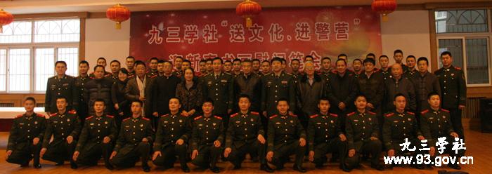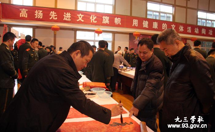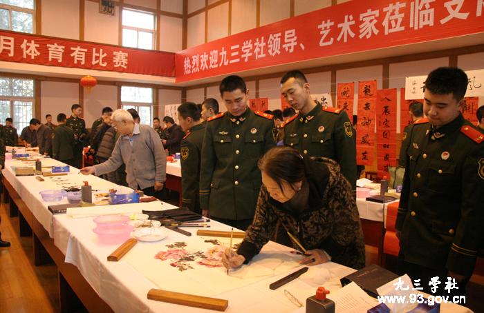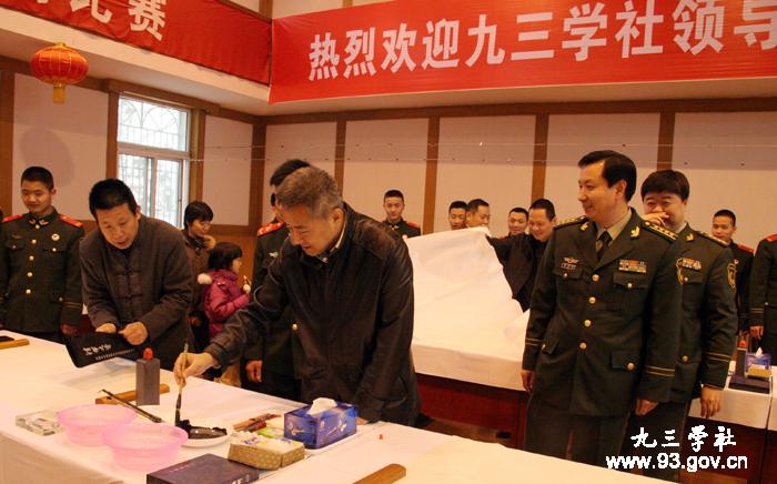 2013年1月27日上午,九三學(xué)社中央書(shū)畫(huà)院和北京九三書(shū)畫(huà)院在武警總部直屬支隊(duì)聯(lián)合舉辦“九三學(xué)社送文化進(jìn)警營(yíng)”迎新春書(shū)畫(huà)慰問(wèn)筆會(huì)活動(dòng)。社中央常務(wù)副主席邵鴻出席講話(huà)并為活動(dòng)開(kāi)筆書(shū)寫(xiě)了“干城”兩個(gè)大字,社中央委員、北京市委秘書(shū)長(zhǎng)劉永泰,社中央委員、中央書(shū)畫(huà)院副院長(zhǎng)、北京九三書(shū)畫(huà)院院長(zhǎng)葉培貴,北京九三書(shū)畫(huà)院院長(zhǎng)溫瑛,副院長(zhǎng)邵玉錚、海國(guó)林以及范建宇、孫和平、方放、李小麟等共12位藝術(shù)家參加。