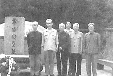 1986年姚奠中與湯炳正等在章太炎先生墓前合影。后立者為章太炎之孫章念馳。(資料照片)