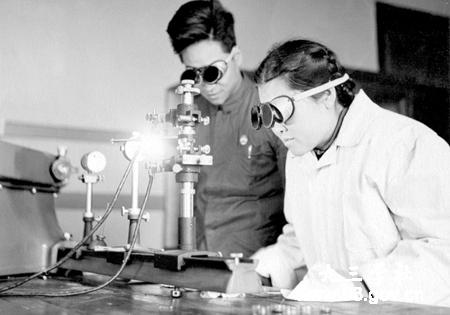 1952年10月,葛庭燧夫婦響應(yīng)建設(shè)東北重工業(yè)基地的號(hào)召,舉家離開(kāi)清華園,來(lái)到沈陽(yáng),參與籌建中國(guó)科學(xué)院金屬研究所。圖為何怡貞在金屬研究所做光譜實(shí)驗(yàn)(左為張功抒)。