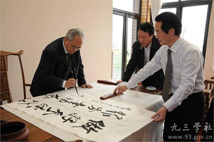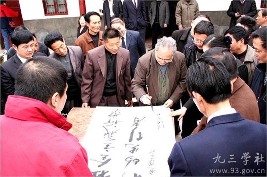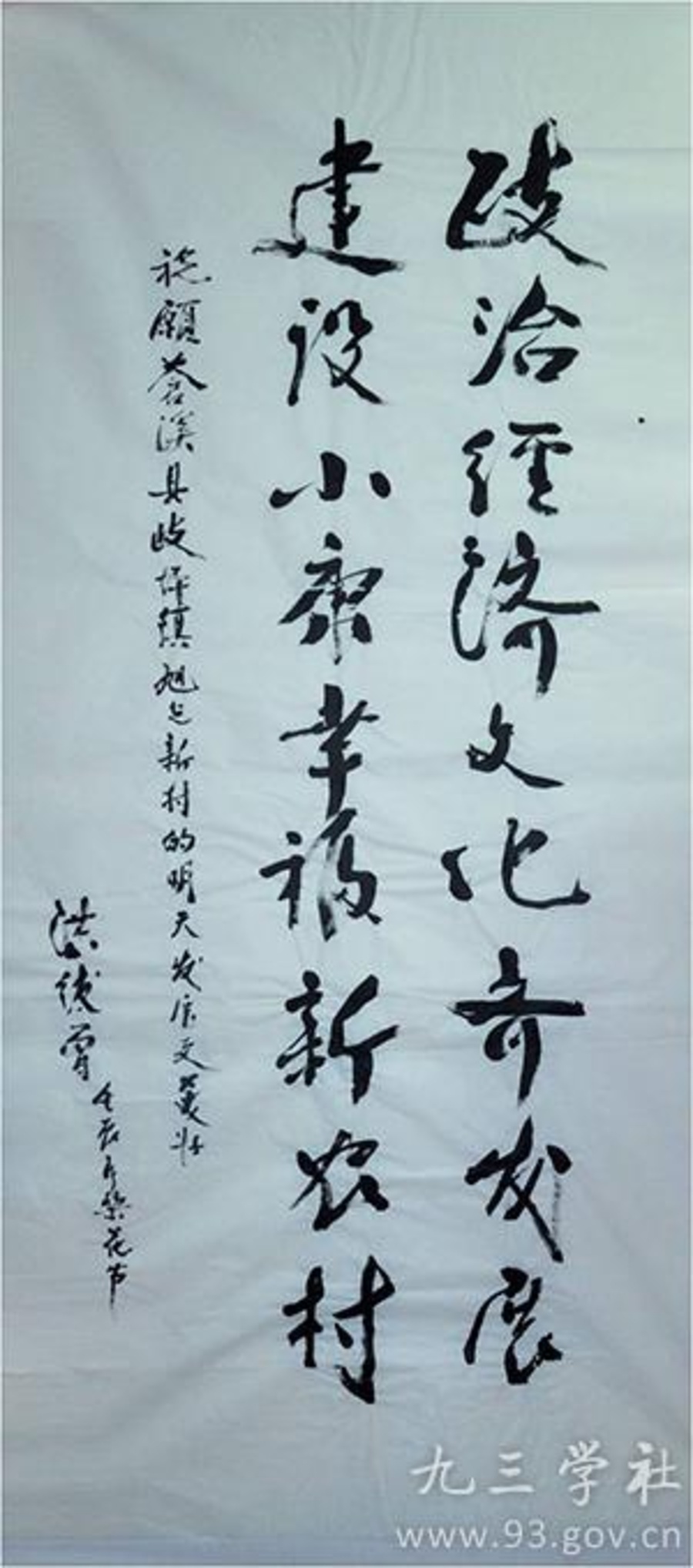 天星現(xiàn)代農(nóng)業(yè)園區(qū)是蒼溪新建的萬畝紅心獼猴桃現(xiàn)代農(nóng)業(yè)園區(qū),洪公一邊走一邊問,看得非常認真,問得非常仔細。在農(nóng)家小院同干部群眾座談時,得知園區(qū)土地由業(yè)主流轉(zhuǎn),村民除獲得土地租金外,還通過在園區(qū)務工獲得收入時,洪公十分高興,揮毫留下了“政治經(jīng)濟文化齊發(fā)展,建設(shè)和諧幸福新農(nóng)村”的墨寶,令大家非常激動。回到酒店晚餐后,洪公來到梨花苑酒店書畫室,再次為九三學社蒼溪委員會重新寫就“做好參政議政,服務幸福蒼溪”的題詞,令我們在場的人無比感動。可誰能料到,這竟是洪公的最后一次蒼溪之行,也是給我們最后的一次題詞!