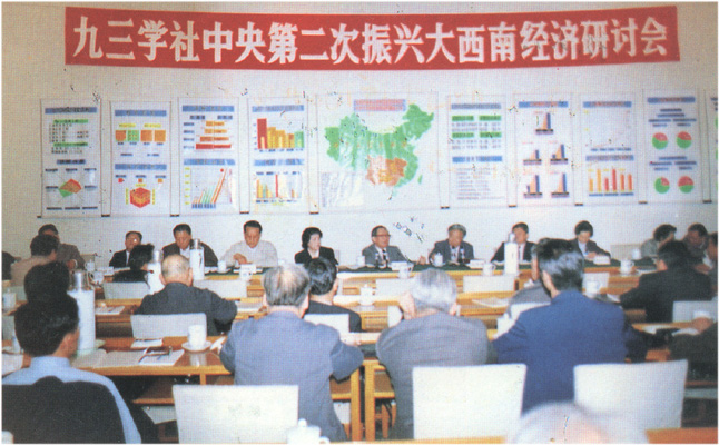 1992年4月,九三學(xué)社中央第二次振興大西南經(jīng)濟(jì)研討會(huì)在北京召開。國家科委主任宋健(主席臺(tái)左七)、中央統(tǒng)戰(zhàn)部副部長(zhǎng)萬紹芬(主席臺(tái)左六)出席了會(huì)議。