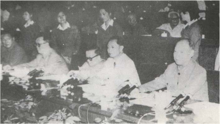 1985年9月3日,許德珩主席(前排左二)主持首都各界紀(jì)念抗日戰(zhàn)爭(zhēng)和世界反法西斯戰(zhàn)爭(zhēng)勝利四十周年大會(huì)。