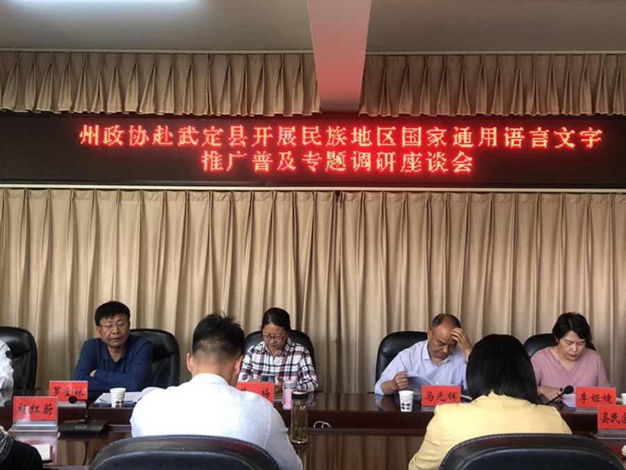 調(diào)研組在州政協(xié)副主席李德勝的帶領(lǐng)下,深入到元謀縣甘塘小學(xué)、甘塘幼兒園,武定縣貓街中學(xué)、倉房村委會,雙柏縣安龍堡鄉(xiāng)中心學(xué)校、青香樹小學(xué),楚雄市大過口鄉(xiāng)中心學(xué)校實地走訪,調(diào)查了解中小學(xué)教師普通話等級達(dá)標(biāo)情況、學(xué)齡兒童學(xué)前學(xué)會普通話情況,以及普及普通話示范村創(chuàng)建情況,并在武定縣政府、安龍堡鄉(xiāng)中學(xué)召開了兩場座談會,聽取縣鄉(xiāng)村干部和學(xué)校教師在少數(shù)民族地區(qū)推廣普及國家通用語言文字方面存在的困難和意見建議。