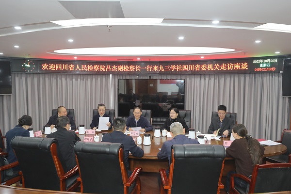 10月20日上午,四川省人民檢察院黨組成員、副檢察長(zhǎng)呂杰一行來(lái)九三學(xué)社四川省委走訪座談,通報(bào)省檢察院今年以來(lái)主要工作情況,并征求意見建議。九三學(xué)社四川省委專職副主委、省政協(xié)副秘書長(zhǎng)陳雩楨出席會(huì)議并講話,九三學(xué)社四川省委秘書長(zhǎng)丁武主持會(huì)議。