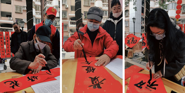 在聯(lián)邦廣場(chǎng)小區(qū)活動(dòng)現(xiàn)場(chǎng),來(lái)自“福州九三書畫齋”的書法家社員揮毫潑墨,一幅幅蒼勁有力、喜慶吉祥的春聯(lián)送到社區(qū)居民和留榕過(guò)年的外地務(wù)工人員手中,讓大家感受到濃濃的年味。