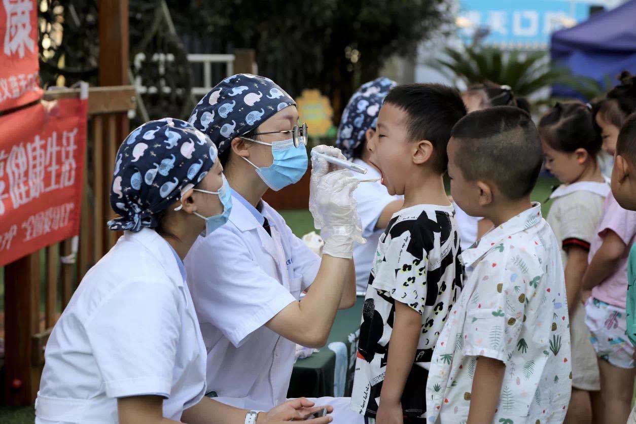 ▲啟動儀式場外遵義市健康教育學學會工作人員對新蒲新區(qū)第一幼兒園幼兒進行口腔體檢