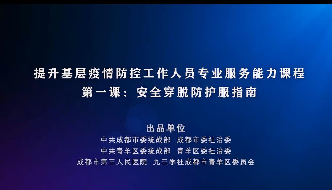 11月5日,中共成都市委統(tǒng)戰(zhàn)部、中共成都市委社治委、中共成都市青羊區(qū)委統(tǒng)戰(zhàn)部、中共成都市青羊區(qū)委社治委等部門高度重視此輪疫情防控期間,身處一線防疫基層醫(yī)務(wù)人員、社區(qū)核酸檢測(cè)人員的安危,遂與九三學(xué)社成都市青羊區(qū)委員會(huì)主委唐艷聯(lián)系,結(jié)合青羊區(qū)委員會(huì)在成都市第三人民醫(yī)院專業(yè)醫(yī)護(hù)力量?jī)?yōu)勢(shì),推出《提升基層疫情防控工作人員專業(yè)服務(wù)能力課程——安全穿脫防護(hù)服指南》科普視頻課件。