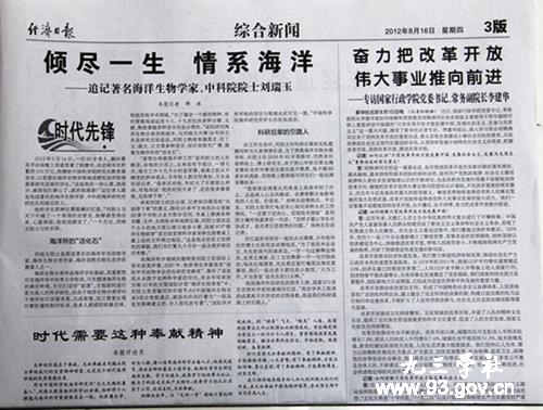 編者按:8月16日,經(jīng)濟(jì)日?qǐng)?bào)3版“時(shí)代先鋒”欄目刊登了記者郎冰采寫(xiě)的報(bào)道《傾盡一生 情系海洋——追記著名海洋生物學(xué)家、中科院院士劉瑞玉》。現(xiàn)予轉(zhuǎn)載,以饗讀者。
