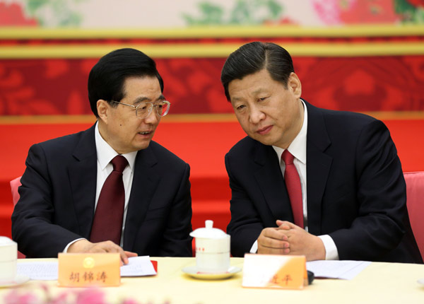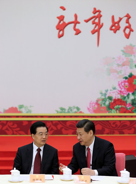 1月1日,中國人民政治協(xié)商會(huì)議全國委員會(huì)在全國政協(xié)禮堂舉行新年茶話會(huì)。這是胡錦濤與習(xí)近平在茶話會(huì)上親切交談。新華社記者 蘭紅光 攝