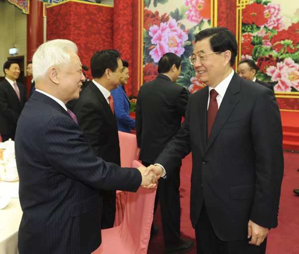 1月1日,全國政協(xié)在北京舉行新年茶話會(huì)。國家主席胡錦濤在茶話會(huì)上同與會(huì)人士親切交談。新華社記者 謝環(huán)馳 攝