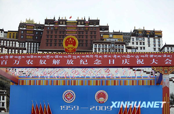 這是3月28日上午8時拍攝的慶祝大會現(xiàn)場。當(dāng)日是首個“西藏百萬農(nóng)奴解放紀(jì)念日”,西藏自治區(qū)上午10時將在拉薩舉行慶祝大會,慶祝西藏百萬農(nóng)奴解放50周年。