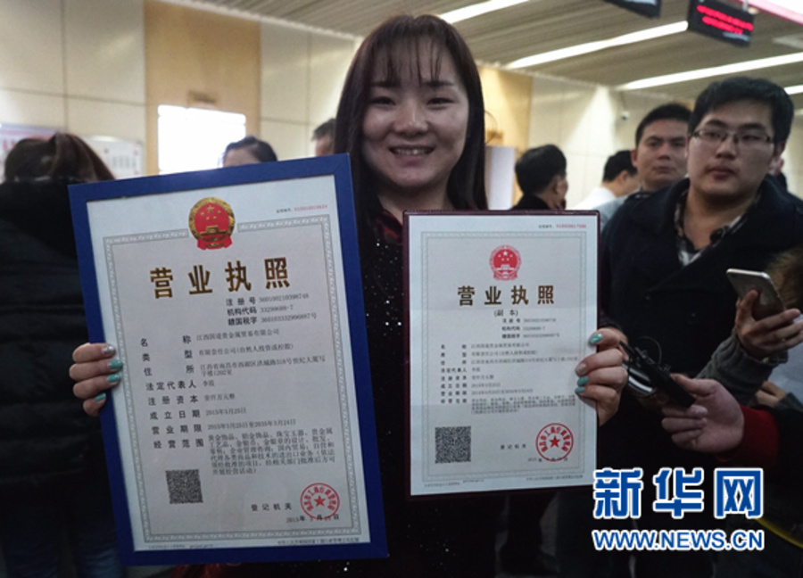 這是2015年3月26日,江西國道貴金屬貿(mào)易有限公司法定代表人李霞在展示她領(lǐng)到的南昌全市首張“三證合一”營業(yè)執(zhí)照和副本。2015年10月1日起,“三證合一、一照一碼”的企業(yè)登記模式在全國全面推行。新華社記者 陳子夏 攝