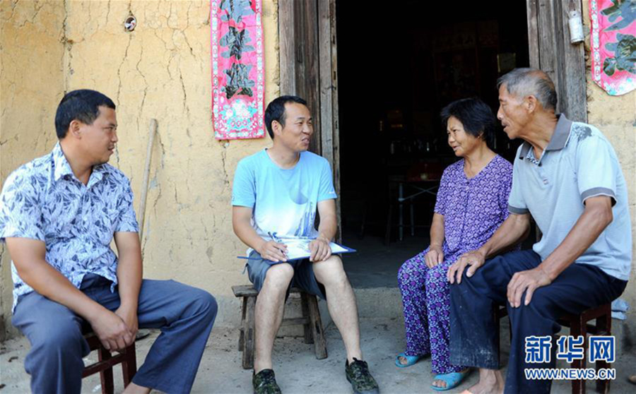 在江西永新縣三灣鄉(xiāng)三灣村,邢鐳(左二)在74歲的村民段老金家里了解土坯房改造情況(2013年8月10日攝)。邢鐳來自湖北,在三灣鄉(xiāng)扎根9年,2017年他剛剛帶領三灣鄉(xiāng)脫貧摘帽。新華社記者 周科 攝