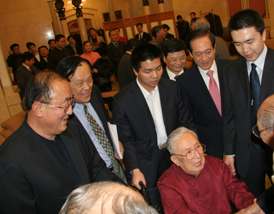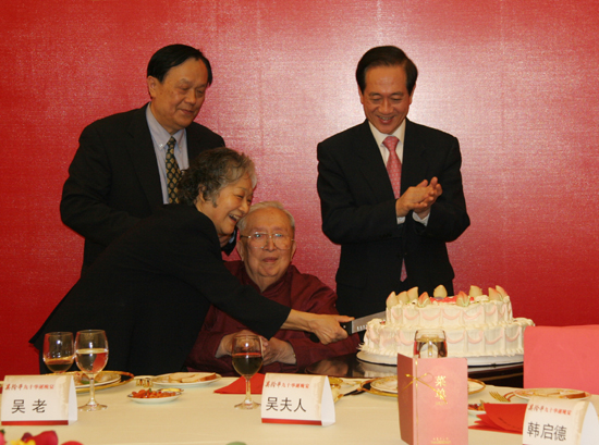 全國(guó)人大常委會(huì)副委員長(zhǎng)、九三學(xué)社中央主席韓啟德代表九三學(xué)社中央發(fā)表了熱情洋溢的祝詞,熱情贊譽(yù)了吳階平對(duì)我國(guó)醫(yī)學(xué)發(fā)展、醫(yī)學(xué)教育以及多黨合作事業(yè)的非凡成就和卓越貢獻(xiàn)。韓啟德深情地說,吳老是深受大家愛戴的著名醫(yī)學(xué)家,很多疑難病人由于他的精湛醫(yī)術(shù),挽回了生命,得到康復(fù)。他擔(dān)任全國(guó)人大常委會(huì)副委員長(zhǎng)之后,仍堅(jiān)持每月到醫(yī)院參加臨床大查房。我有幸在幾年前跟隨吳老在北京大學(xué)泌尿研究所參加一次大查房。最令我嘆服的是他還記得幾十年前許多病人的具體病癥、認(rèn)診治經(jīng)過,甚至他們的家庭情況與地址,使我真正感受到一位醫(yī)學(xué)大師的大家風(fēng)范。韓啟德說,吳老是一面旗幟,是中國(guó)廣大知識(shí)分子心中的旗幟。他走過的道路代表著幾代中國(guó)知識(shí)分子前進(jìn)的軌跡,這面旗幟將引領(lǐng)與鼓舞中國(guó)廣大知識(shí)分子為著振興中華的偉大目標(biāo)奮斗不已。韓啟德滿懷激情誦讀了九三學(xué)社中央委員會(huì)為祝賀吳階平九十華誕而撰寫的90字祝詞:偉哉!坦坦階平,江左之英。良醫(yī)良相,未冠有徵。協(xié)和展翼,悟道芝城。杏林國(guó)手,澤厚生靈。種橘禹甸,掘井帝京。刀圭廣布,惠及邦盟。北辰灼灼,社集眾星。殊勛炳耀,商略權(quán)衡。公忠惇敘,鐘鼓和鳴。泰然雍穆,頌此德馨。期頤可待,長(zhǎng)葆康寧。