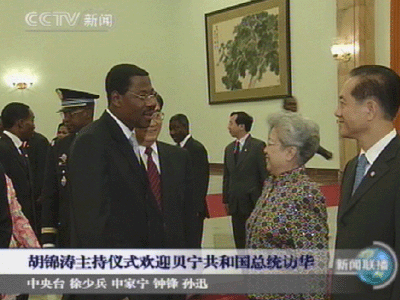 國家主席胡錦濤8月28日下午在人民大會堂北大廳主持儀式,歡迎貝寧共和國總統(tǒng)托馬·博尼·亞伊訪華。全國人大常委會副委員長、九三學(xué)社中央主席韓啟德出席歡迎儀式。出席歡迎儀式的還有國務(wù)院副總理吳儀、全國政協(xié)副主席白立忱等。隨同亞伊總統(tǒng)來訪的有,總統(tǒng)夫人,發(fā)展、經(jīng)濟(jì)和財政部長,外交部長,農(nóng)業(yè)、牧業(yè)和漁業(yè)部長等。亞伊是應(yīng)胡錦濤的邀請于昨天抵達(dá)北京,開始對我國進(jìn)行為期7天國事訪問的。這是他作為總統(tǒng)首次訪華。