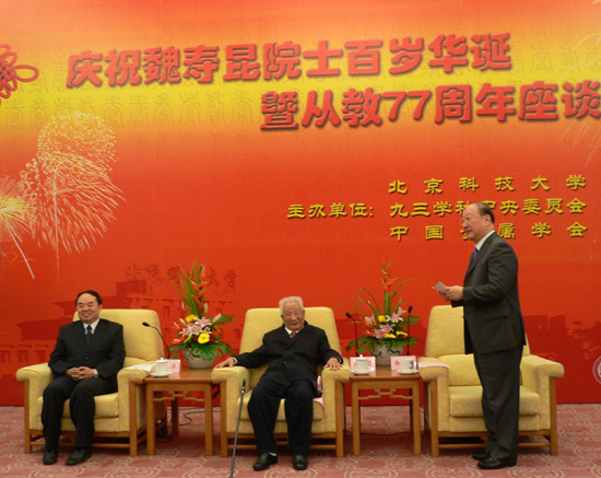 魏壽昆先生的學(xué)生徐匡迪起立致辭,以表示對(duì)恩師辛勤培育的感謝和對(duì)先生百歲華誕的祝賀。徐匡迪說(shuō):“科技的發(fā)展離不開(kāi)對(duì)高層次創(chuàng)新人才的需求,而魏先生以其勤勤懇懇、兢兢業(yè)業(yè)的百年人生,為全社會(huì)樹(shù)立了楷模,永遠(yuǎn)激勵(lì)著我們不斷向前。作為后輩的我們,定會(huì)在先生高尚情操和精神的鼓舞下,堅(jiān)持不懈,勇于進(jìn)取,將我國(guó)科技和工程的發(fā)展推上新臺(tái)階,共同推進(jìn)我國(guó)全面建設(shè)小康社會(huì)的進(jìn)程!”