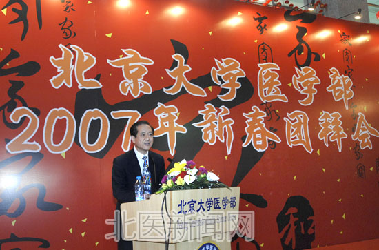 1月24日上午,新落成的北京大學醫(yī)學部教學大樓一樓大廳張燈結彩,火紅的燈籠映照著所有人的笑臉,北京大學醫(yī)學部2007年新春團拜會在這里舉行。全國人大常委會副委員長、九三學社中央主席、北京大學醫(yī)學部主任韓啟德出席會議并講話。韓啟德說:“北醫(yī)是個家,今天我們這個家庭的代表歡聚一堂,其樂融融。”韓啟德的一席話為新春團拜會做了精辟概括。韓啟德說,中共十六屆六中全會提出構建社會主義和諧社會,對北大醫(yī)學部來說,則是要構建和諧北醫(yī),這也是“創(chuàng)建世界一流大學”的題中之義。對北醫(yī)今后的發(fā)展方向,韓啟德指出,一是要創(chuàng)造人盡其才的機制和氛圍,二是要建立教學相長的師生關系,三是要建立融洽的干群關系,四是要建立有機結合的黨政關系,五是要加強校北大本部和醫(yī)學部的融合,六是要加強附屬醫(yī)院的工作,七是在職人員與離退休人員要相互關愛,八是要樹立和而不同的根本理念。韓啟德強調(diào),青年教師要有自信,教輔人員要有光榮感,行政干部要有職業(yè)感。行政要為學術服務,建立服務型機關;教師則要理解和支持行政干部。韓啟德勉勵大家勇于實踐、積極探索、不斷進步。