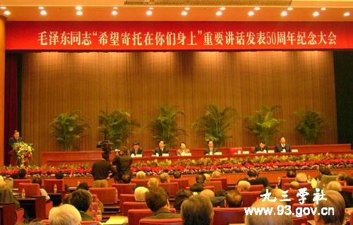 “世界是你們的,也是我們的,但歸根結(jié)底是你們的”,“你們是早晨八九點(diǎn)鐘的太陽,希望寄托在你們身上”。50年前,毛澤東訪蘇時對中國留蘇學(xué)子的一次講話,對中國留學(xué)生和年輕人產(chǎn)生了重大影響,鼓舞了幾代年輕學(xué)子。今年是毛澤東同志接見留蘇學(xué)生并發(fā)表“希望寄托在你們身上”重要講話50周年。11月17日,毛澤東同志“希望寄托在你們身上”重要講話發(fā)表50周年紀(jì)念大會在人民大會堂舉行。全國人大常委會副委員長、九三學(xué)社中央主席、歐美同學(xué)會·中國留學(xué)人員聯(lián)誼會會長韓啟德出席會議并講話。
