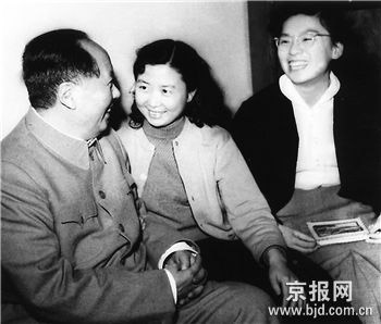 資料圖3 毛澤東與中國留學(xué)生蘇紅(中)、沈?qū)?/span>(右一)親切交談。