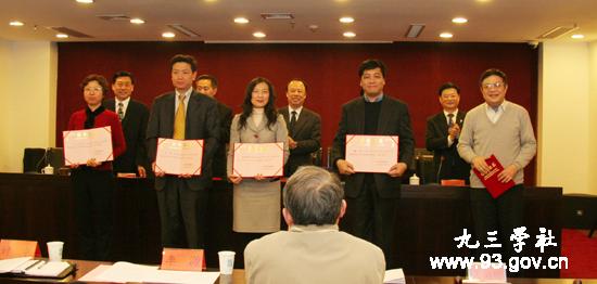 九三學(xué)社中央秘書長徐國權(quán)宣讀了《關(guān)于表彰九三學(xué)社中央專門委員會優(yōu)秀參政議政文稿作者的決定》。決定對優(yōu)秀參政議政文稿的作者張三力、繳遠(yuǎn)、肖京華、劉中、李微、張鐘寧、吳伯明、朱大保、鄭奕榮、劉志仁、黃鴻翔、王元豐、孟白、吳明、賴明等15名同志予以表彰,并頒發(fā)榮譽證書。