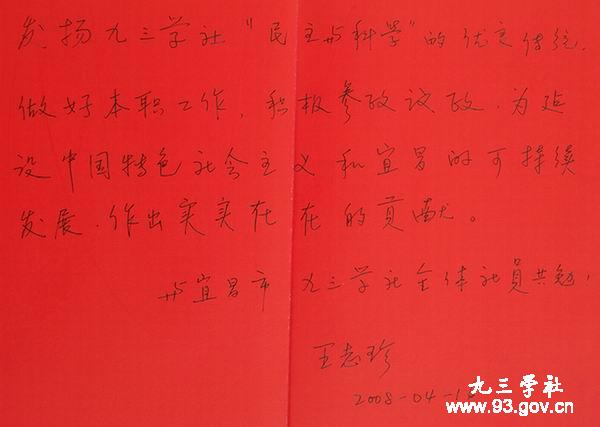 王志珍還為九三學(xué)社宜昌市委題詞,并與大家合影留念。