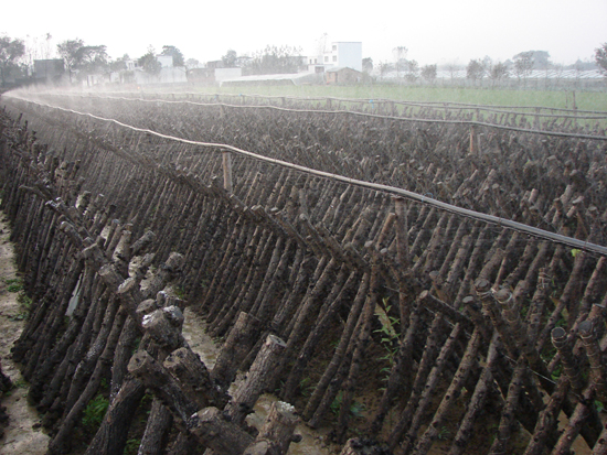 走進源匯區(qū)陰陽趙鄉(xiāng)的農(nóng)田,一排排搭成人字形的木架常常會引得你駐足。木頭是普通的朽木,上邊布滿了仿野生的木耳,成菱角形,厚實而肥碩。木架上方是一條條噴灌水管,一開閘門,如絲線般的水霧滿天飛舞,水霧均勻地灑在木架上,構(gòu)成一幅壯觀的水幕噴泉,著了水的木耳瞬間變得又厚又大。