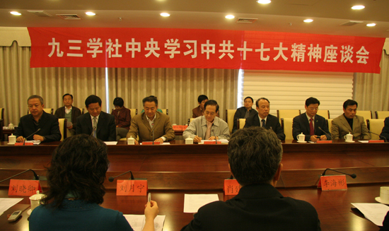 ,學(xué)習(xí)座談中共十七大精神。九三學(xué)社中央主席韓啟德、常務(wù)副主席陳抗甫出席會議并講話。座談會由九三學(xué)社中央副主席邵鴻主持。