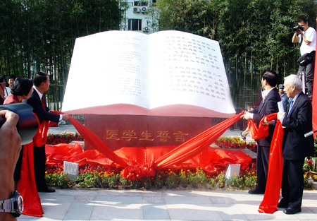 9月24日下午,復旦大學上海醫(yī)學院福慶路旁大草坪彩旗飛舞,禮花齊鳴。牽動無數(shù)醫(yī)學生心弦的醫(yī)學生誓言碑在此落成。全國人大常委會副委員長、九三學社中央主席韓啟德專程趕來,與復旦大學黨委書記秦紹德和陳灝珠、聞玉梅兩位院士共同為誓言碑揭幕。
