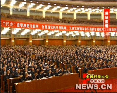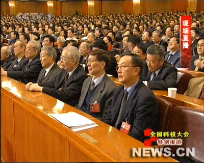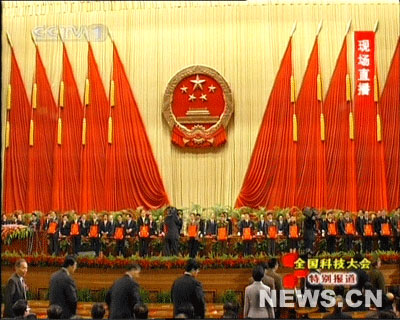 在全國(guó)科學(xué)技術(shù)大會(huì)開幕式上,中共中央總書記、國(guó)家主席胡錦濤發(fā)表了題為《堅(jiān)持走中國(guó)特色自主創(chuàng)新道路,為建設(shè)創(chuàng)新型國(guó)家而努力奮斗》的重要講話并為獲得2005年度國(guó)家最高科學(xué)技術(shù)獎(jiǎng)的人員頒發(fā)獎(jiǎng)勵(lì)證書和獎(jiǎng)金。國(guó)務(wù)院總理溫家寶宣讀了《國(guó)務(wù)院關(guān)于2005年度國(guó)家科學(xué)技術(shù)獎(jiǎng)勵(lì)的決定》。胡錦濤等黨和國(guó)家領(lǐng)導(dǎo)人分別向獲獎(jiǎng)人員的代表頒獎(jiǎng)。此次會(huì)議的重點(diǎn)是部署實(shí)施《國(guó)家中長(zhǎng)期科學(xué)和技術(shù)發(fā)展綱要(2006―2020)》,動(dòng)員全社會(huì)堅(jiān)持走中國(guó)特色自主創(chuàng)新之路,為建設(shè)創(chuàng)新型國(guó)家而努力奮斗,開創(chuàng)全面建設(shè)小康社會(huì)、加快推進(jìn)社會(huì)主義現(xiàn)代化的新局面。