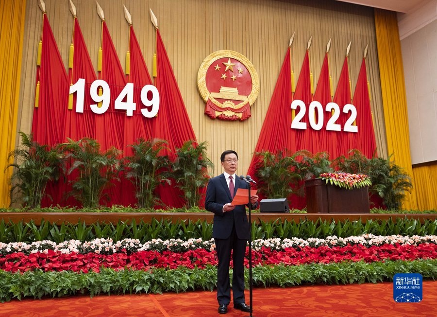 人民大會(huì)堂宴會(huì)廳華燈璀璨、鮮花綻放,洋溢著喜慶熱烈的節(jié)日氣氛。主席臺(tái)上方,莊嚴(yán)的國(guó)徽高懸,“1949-2022”的大字年號(hào)在鮮艷的紅旗映襯下格外醒目。