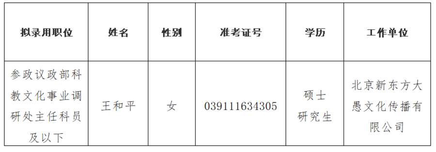 根據2018年度中央機關及其直屬機構考試錄用公務員工作有關要求,經過筆試、面試、體檢和考察等程序,確定王和平同志為九三學社中央擬錄用公務員,現予以公示。公示期間,如有問題,請向九三學社中央辦公廳人事處反映。