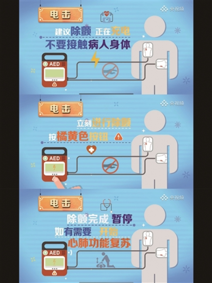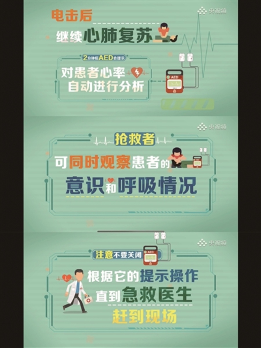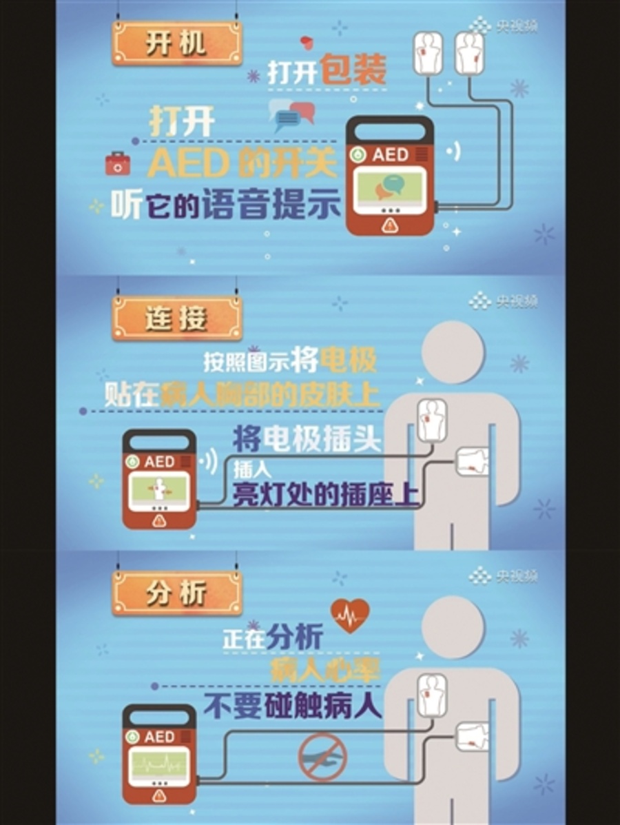 AED(自動(dòng)體外除顫器)是一種便攜式的醫(yī)療設(shè)備,它可以診斷特定的心律失常,并且給予電擊除顫。AED的體積不大,但卻是能夠在第一時(shí)間挽救患者的利器。“目前在公共場(chǎng)所配置的AED均有內(nèi)置電腦和對(duì)外聲光提示,可以進(jìn)行智能判斷、防止誤操作,因而AED的操作比CPR(人工心肺復(fù)蘇)更為簡(jiǎn)單易用。”黃以寬介紹,在心跳驟停時(shí),“黃金4分鐘”內(nèi)的“AED+CPR”才是最有效制止猝死的辦法。