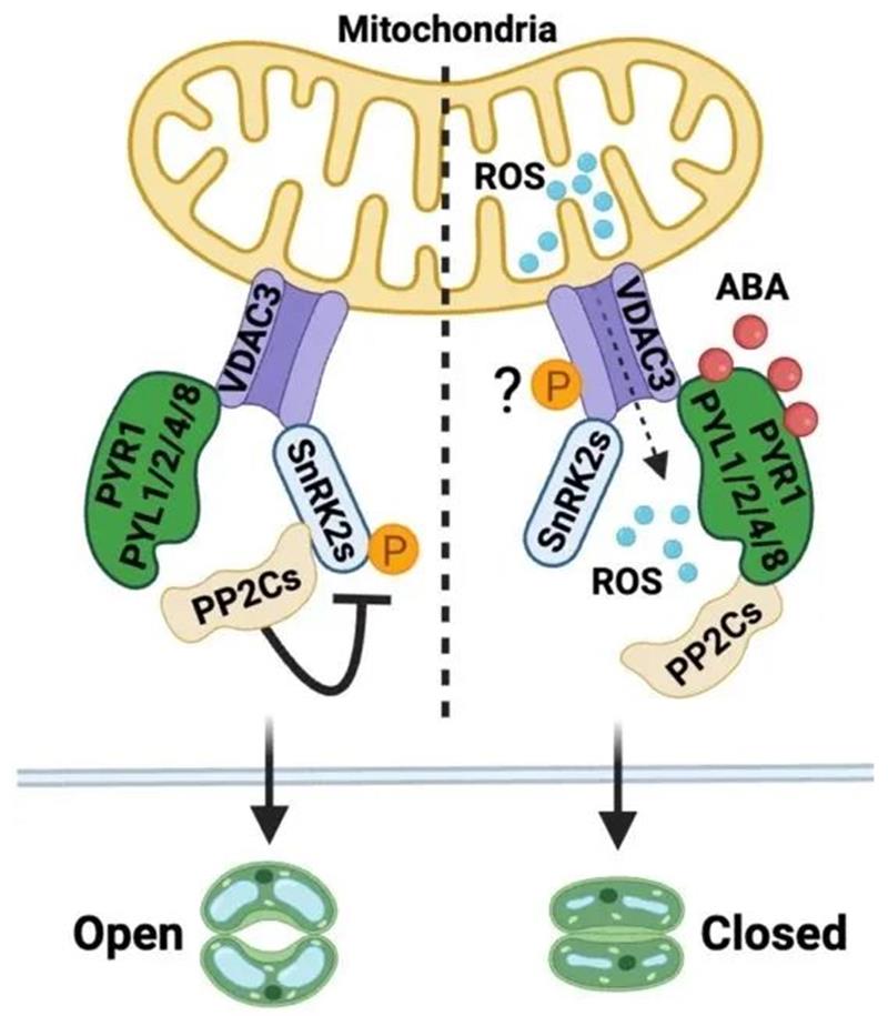 氣孔是植物與環(huán)境進(jìn)行氣體交換的重要通道。植物遭遇干旱或者鹽分脅迫時(shí),能夠激活脫落酸(abscisic acid, ABA)信號(hào)途徑來(lái)促進(jìn)氣孔關(guān)閉,避免過(guò)多的水分喪失并維持細(xì)胞滲透勢(shì)。PYR/PYL/RCAR蛋白、PP2C蛋白和SnRK2s蛋白是ABA信號(hào)通路的關(guān)鍵組分。這三個(gè)蛋白家族的成員眾多且功能冗余,有助于確保植物對(duì)各種脅迫的靈活響應(yīng)。張學(xué)斌團(tuán)隊(duì)的研究發(fā)現(xiàn),VDAC3能夠與ABA信號(hào)通路中9個(gè)PYR/PYL/RCAR家族蛋白成員和3個(gè)SnRK2s蛋白家族成員發(fā)生相互作用。