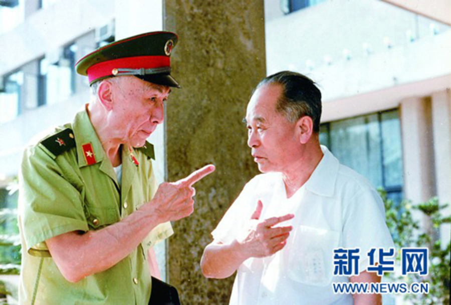 程開(kāi)甲(右)與朱光亞(左)交談。 新華社發(fā)(總裝備部供圖)