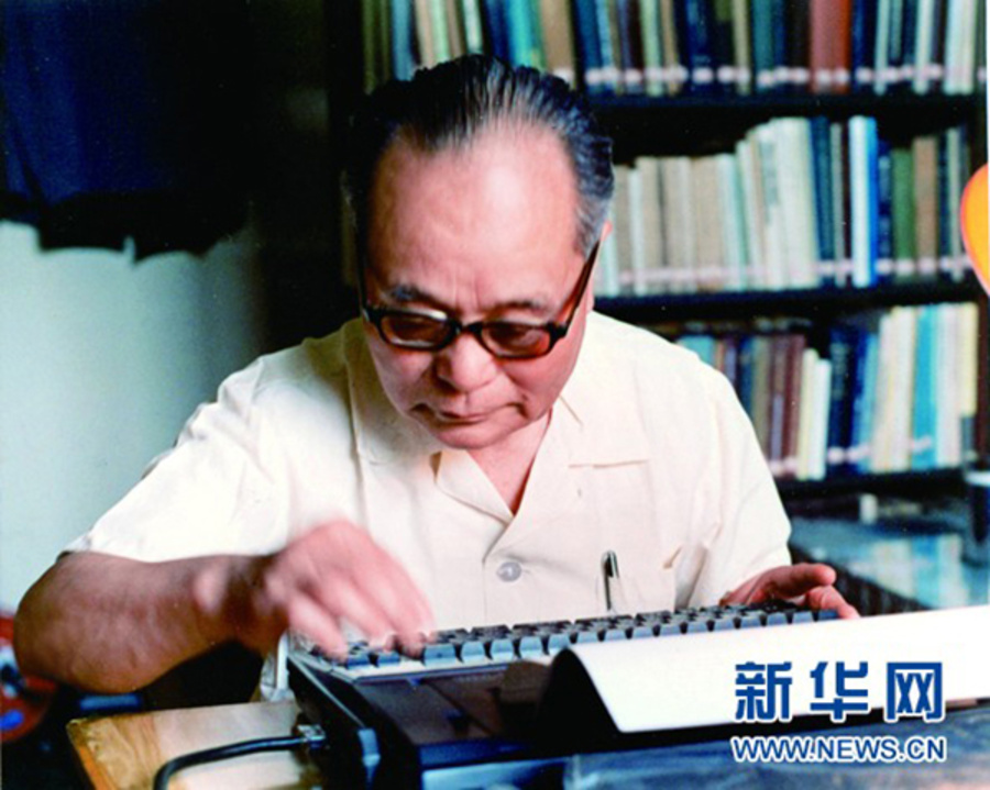 程開(kāi)甲在打字機(jī)上撰寫論文。新華社發(fā)(總裝備部供圖)