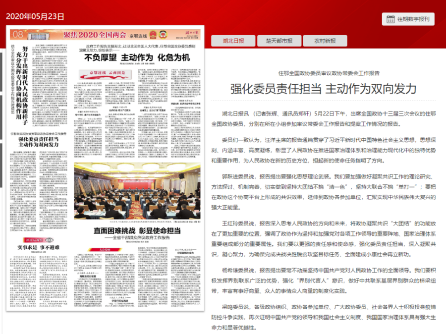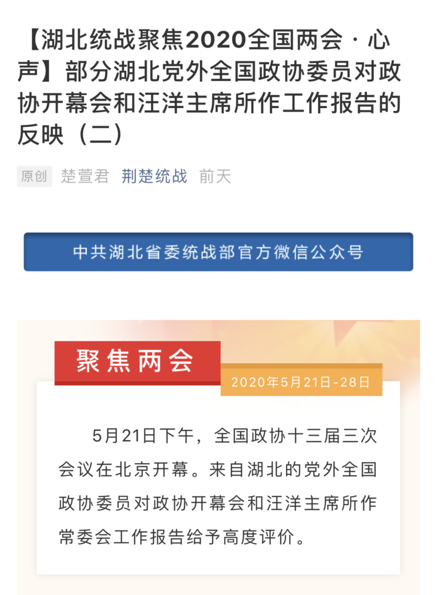 受到《湖北日報》、《荊楚統(tǒng)戰(zhàn)》微信公眾號關(guān)注,高度評價汪洋主席所作的常委會工作報告
