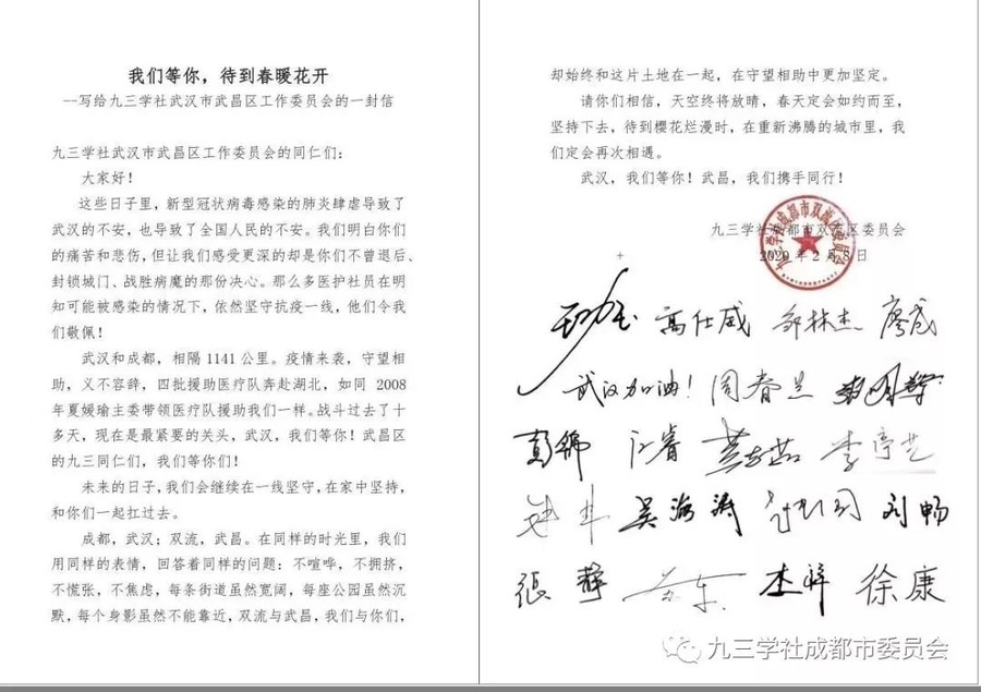 2月8日,中國的傳統(tǒng)節(jié)日元宵節(jié)。《我們等你,待到春暖花開》,一封來自春天的書信,穿越秦巴叢叢山脈,跨過千里時空距離,飛往武漢,寄到武昌。這是一封由九三學(xué)社成都市雙流區(qū)委員會17名班子成員和1名普通社員聯(lián)合簽名、飽含深情、熱情洋溢的慰問信,寄給了九三學(xué)社武漢市武昌區(qū)委員會,有關(guān)切,有鼓勵,有期盼…在這特殊的時節(jié),他們用信封裝滿牽掛,給九三同仁帶去問候,給戰(zhàn)疫社友送去溫暖,給武漢送達最美好的祝愿!