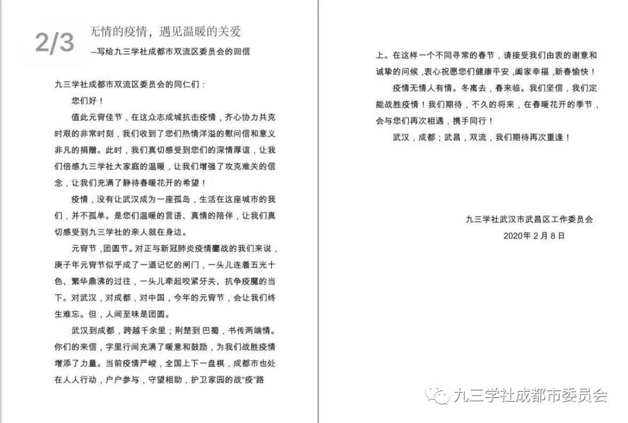 很快,九三學(xué)社武昌市委員會回了信,《無情的疫情,遇見溫暖的關(guān)愛》。九三學(xué)社武昌區(qū)工委主委亢德芝激動地說:“謝謝成都市雙流區(qū)委員會的同仁們,謝謝你們的祝福,謝謝你們的關(guān)心,謝謝你們讓我們充滿了期待!我們堅信定能戰(zhàn)勝疫情,我們堅信定能在春暖花開的季節(jié)攜手同行!”