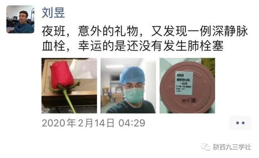 “夜班,意外的禮物,又發(fā)現(xiàn)一例深靜脈血栓,幸運(yùn)的是沒有肺栓塞”。2月14日凌晨4點(diǎn)半,剛剛結(jié)束一場搶救的劉昱寫下朋友圈,配圖的玫瑰和糖果,是繁忙工作中的一份意外之禮。“我們醫(yī)療隊的易隊長專門聯(lián)系花店買了玫瑰,整理修剪好挨個房間給大家送的花,糖果可能是當(dāng)?shù)氐闹驹刚咚蛠淼摹?rdquo;雖然辛苦,但在劉昱看來,支援武漢的這些日子以來,還有很多事溫暖著他的心。“我們住的酒店,哪怕再晚也會為我們準(zhǔn)備好吃的東西、凌晨1、2點(diǎn)也會有專門的公交車接送上下班,后方的家人、孩子有省婦聯(lián)、朋友、醫(yī)院領(lǐng)導(dǎo)同事們的照顧,尤其是一些黨小組活動,也會邀請我們黨外人士參加,大家都為了一個目標(biāo)努力。”