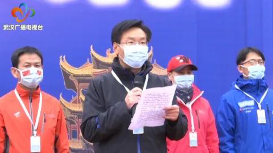 梁鳴在武漢雷神山醫(yī)院首批外省醫(yī)療隊集中撤離儀式上致辭 (圖片來源:武漢廣播電視臺微信公眾號)