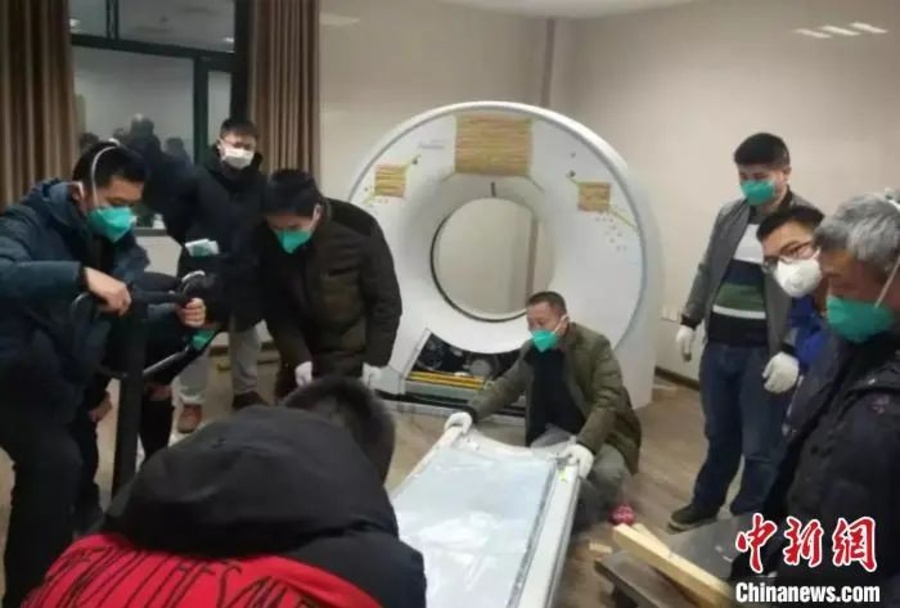 1月29日,由360公益基金會從香港采購的移動式X光機運抵黃岡市中醫(yī)醫(yī)院,幾位“全副武裝”的工程師正在全力安裝調(diào)試。(360供圖)