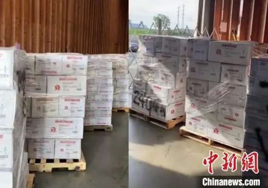 海外一處倉庫。360公益基金會全球?qū)べ彛诋數(shù)厝A人幫助下,采購到一批防護服,并準備發(fā)往中國。(360供圖)