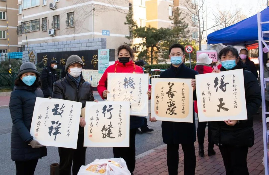 作為首師大社區(qū)的一名常住居民,葉教授主動為社區(qū)居民謀實事。2月24日,一直“宅居抗疫”的葉培貴教授,第一時間報名參加社區(qū)防控值守,雖然學校統(tǒng)戰(zhàn)部和社區(qū)居委會表示希望老師們做好二線工作,但他仍然參與了值守工作。不僅如此,他還把對社區(qū)工作人員的關心進一步擴大到了其它社區(qū)。3月4日他自費購買了一些慰問品,和八里莊街道書記曾濤等同志一起慰問了美麗園、水云居等六個社區(qū),并為每個社區(qū)贈送了他手書的“平安是福”,祝福社區(qū)百姓和值守人員平安。