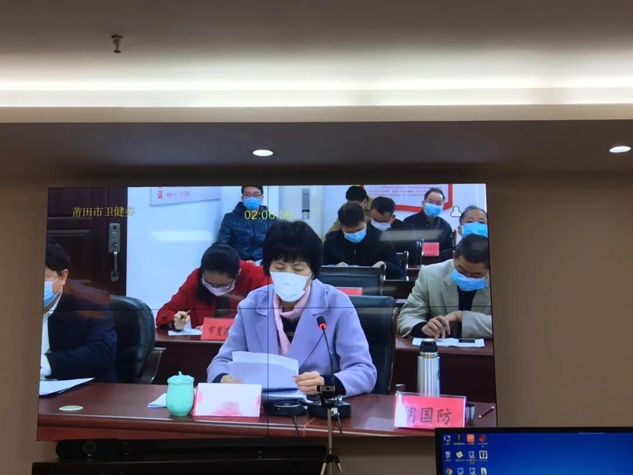 蔡國萍(中)在莆田市疫情防控視頻會上布置工作