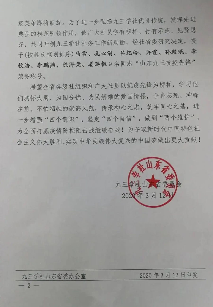 3月12日,孔心涓被九三學(xué)社山東省委授予“山東九三抗疫先鋒”榮譽(yù)稱號(hào)。截至發(fā)稿前,她還在一線奮戰(zhàn),她相信,回青島的日子近了,和家人團(tuán)聚的日子近了,正如她所說,“剛到武漢時(shí)天氣很冷,現(xiàn)在暖和了,櫻花也開了,春天來了,一切美好都將隨之而來。”(姜玉蘭)
