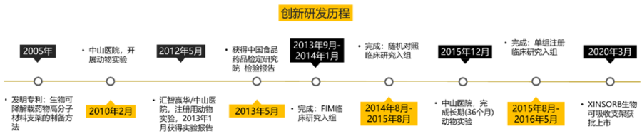 2005年,研發(fā)團(tuán)隊(duì)獲得了關(guān)鍵性專利:生物可降解載藥物高分子材料支架的制備方法。其后,通過(guò)反復(fù)對(duì)材料配方進(jìn)行優(yōu)化、原型迭代,于2010年2月開(kāi)始在中山醫(yī)院開(kāi)展臨床前評(píng)價(jià)。2013年5月正式獲得中國(guó)食品藥品檢定研究院檢驗(yàn)報(bào)告,可以開(kāi)展臨床研究。