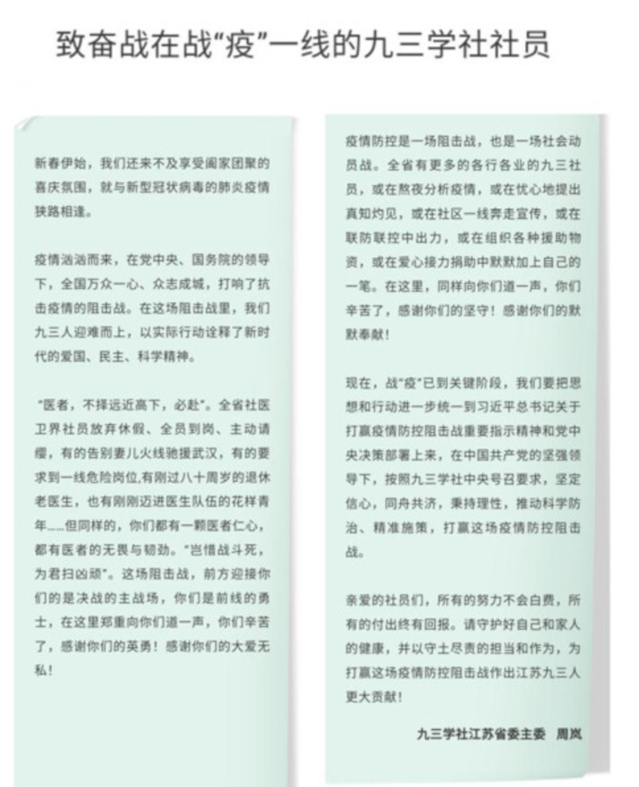疫情防控已到最為嚴(yán)峻的時刻,需要大家保持昂揚的斗志、旺盛的精力和健康的體魄,全力投入抗“疫”斗爭。為此,周嵐主委發(fā)出“致奮戰(zhàn)在戰(zhàn)‘疫’一線的九三學(xué)社社員”的慰問信,鼓舞士氣、增添斗志。