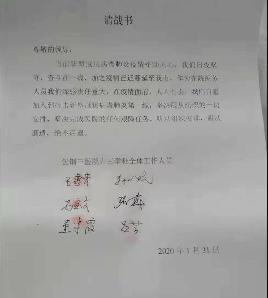 燈亮一盞,光灑成片。一封封請(qǐng)戰(zhàn)書、一個(gè)個(gè)紅色指印、一個(gè)個(gè)簽名,是內(nèi)蒙古九三人“以命相托”應(yīng)對(duì)新型冠狀病毒感染的肺炎疫情阻擊戰(zhàn)的決心和擔(dān)當(dāng)!在他們發(fā)出“若有戰(zhàn),召必回,戰(zhàn)必勝!”的錚錚誓言中,浸潤著九三人的明責(zé)、履責(zé)、盡責(zé)……向他們致敬!愿他們平安!